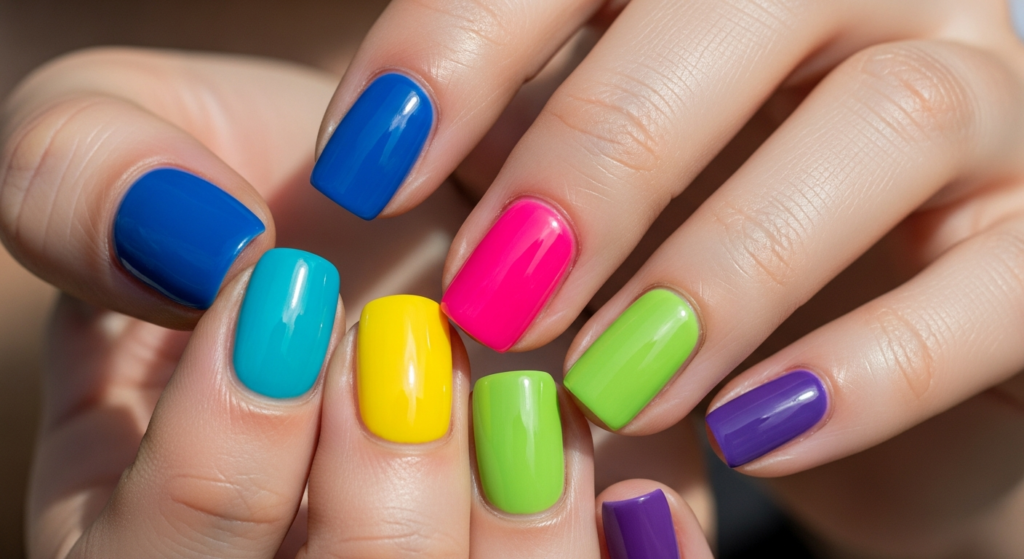 Mix bold shades like neon green with deep burgundy or cobalt blue with orange. Balance the chaos with a glossy finish to keep it polished rather than messy.