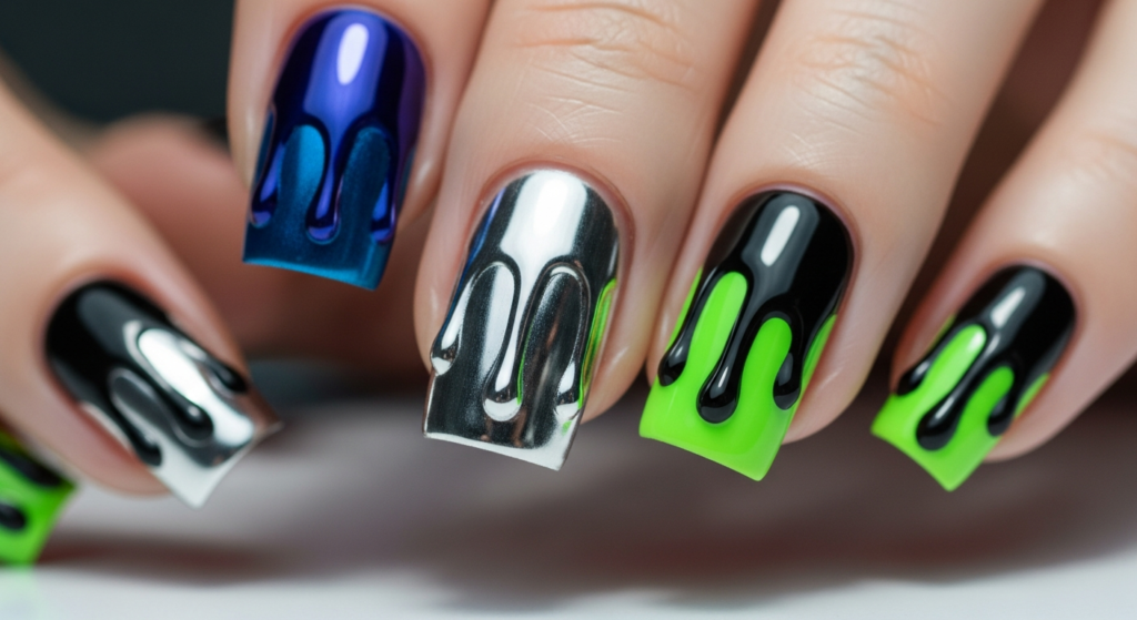 Use contrasting colors like black drips over nude or neon drips over white. A glossy topcoat enhances the fluid illusion.