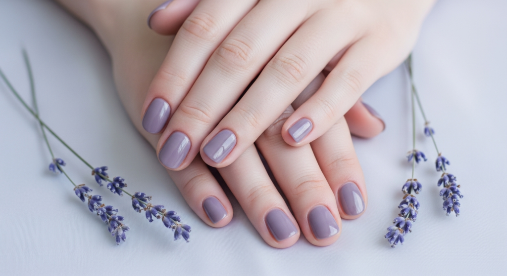 • Short to medium nail lengths in a rounded or oval shape showcase soft lavender most beautifully — the delicate quality of the shade works best on a clean, simple canvas rather than competing with an elaborate nail shape.
