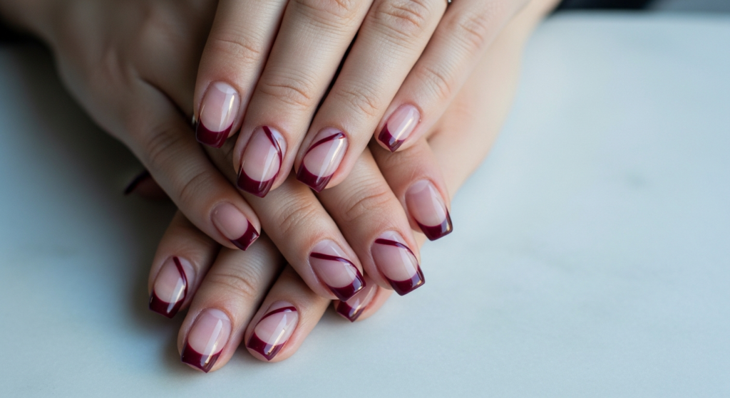 • The most viral twisted French tip variations currently include: a deep burgundy tip on a sheer nude base (the “chocolate French” made more dramatic); a pastel mint or sage green tip on an ivory base; a thin gold line tip rather than a filled tip; a reverse French (color at the base of the nail rather than the tip); and a diagonal French tip (a single diagonal line rather than the traditional curved horizontal).