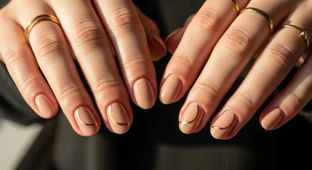 The final viral cute simple nail style in this guide is perhaps the most understated — and, for many who discover it, the most genuinely beautiful: a clean, perfectly applied neutral base with a single, minimal gold detail. One thin line at the base of the nail. One small gold dot at the corner. One tiny crescent of gold at the tip. A barely-there accent that transforms a simple nude nail into something that catches the light in a way that no one can quite explain but everyone immediately notices.