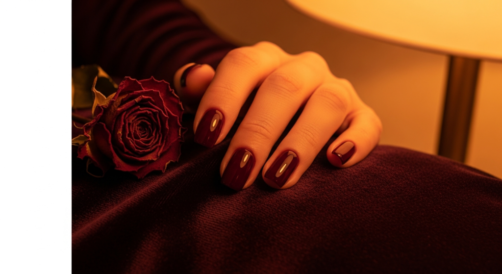 Deep burgundy gel nails pair most beautifully with gold jewellery, warm earth tone outfits, and the rich fabrics of the cooler seasons — cashmere, velvet, suede, and leather all complement the warmth and depth of this colour with remarkable elegance.