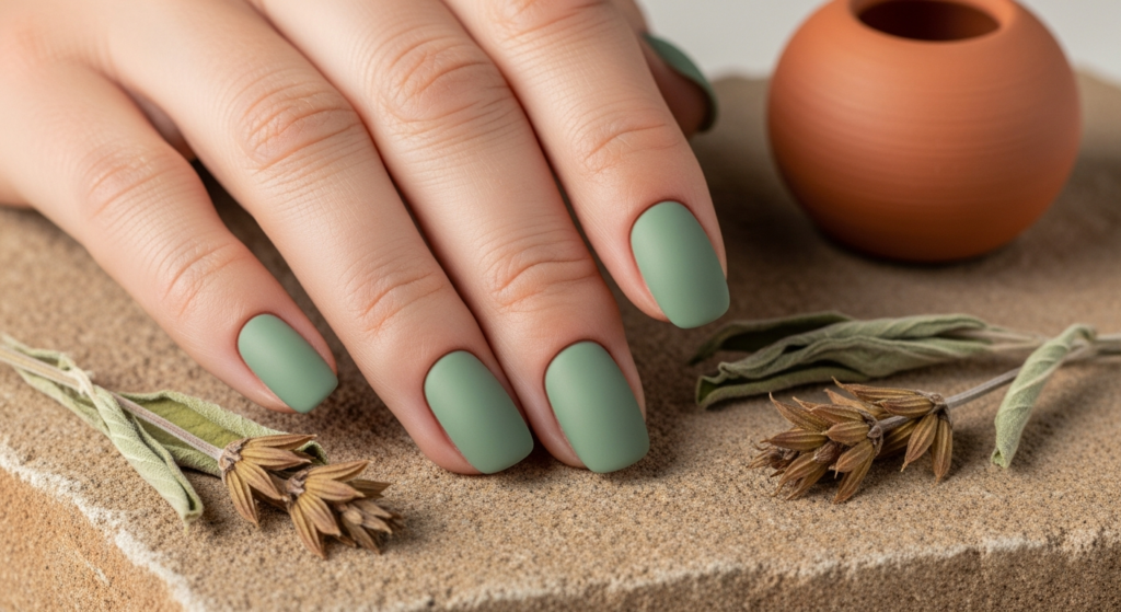 Styling Tip: Choose a sage green shade with a grey or dusty quality — a true sage rather than a bright or yellow-leaning green — for the most refined and wearable result. A matte or satin finish enhances the organic, dusty quality of sage green most effectively and gives the nails a soft, editorial depth that a fully glossy finish cannot achieve with this particular colour. Sage green nails look most beautiful on medium to longer nail lengths in oval or almond shapes where the full tone and texture of the shade can be fully appreciated.