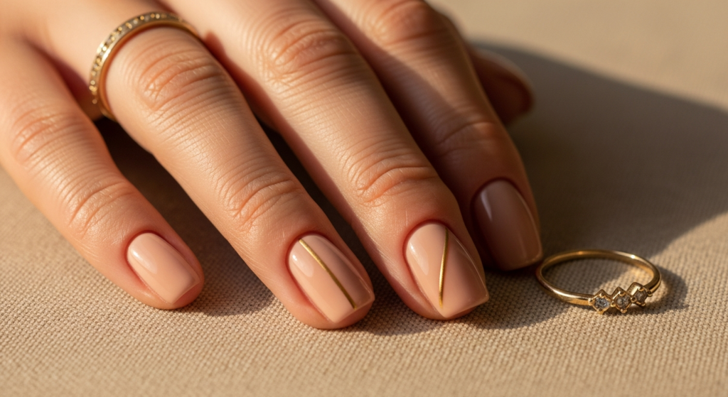 A warm nude gel base featuring a single, precisely painted gold line — diagonal, vertical, or curved across one accent nail — is one of the most elegant and most wearable examples of simple gel nail art available. It introduces artistic detail without complexity, decoration without distraction, and a touch of luxury without drama.