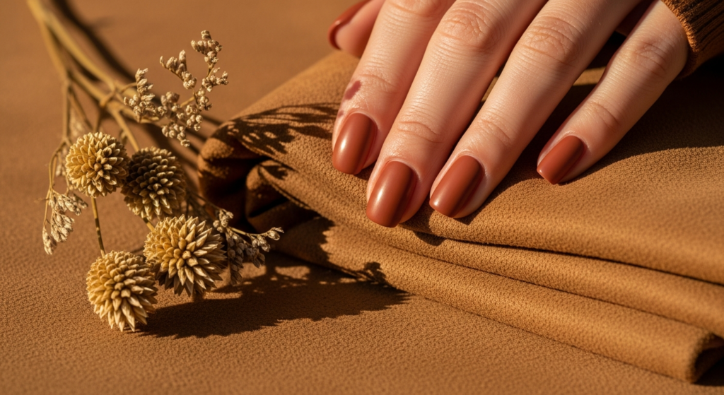 Terracotta satin gel nails pair most naturally with autumn wardrobe staples — linen, suede, cashmere, and leather in complementary earth tones — creating a fully cohesive warm-season aesthetic from fingertip to wardrobe.
