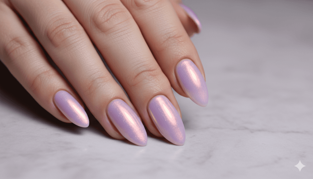 Pearlescent lavender almond nails create one of nail inspo’s most ethereally beautiful and most specifically distinctive colour experiences — a barely-there, cool-warm balanced lavender with a pearl shimmer applied over it that creates a nail that shifts between soft purple, pale pink, and barely-there gold as the light changes, creating a surface of multi-dimensional, quietly spectacular iridescence. The almond shape’s multiple curved surfaces make the pearlescent shifting quality particularly visible and particularly beautiful.