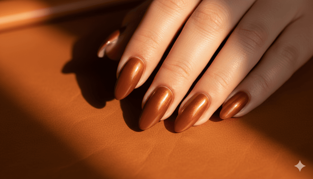 The glazed finish over a warm chocolate base creates a nail surface of considerable material richness — the glaze adds a warm inner luminosity to the brown’s inherent depth, creating a colour quality that moves between a rich matte chocolate in shadow and a warm, amber-lit glowing surface in direct light. The almond shape maximises this colour-shifting quality through its multiple curved surfaces, creating a nail of continuous, dynamic visual interest.