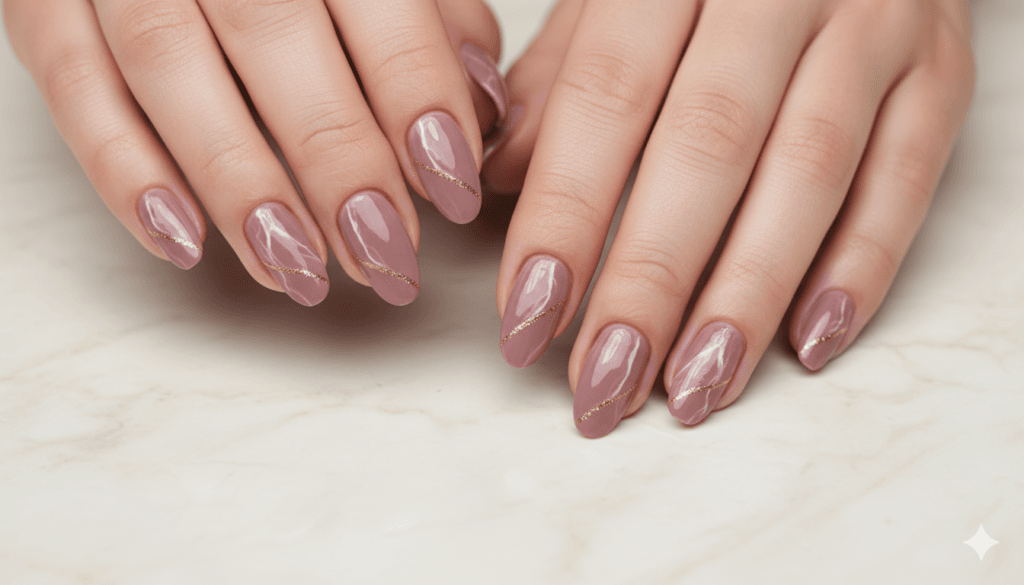 The marble veining in dusty rose tones — fine white or pale gold lines against a soft, muted pink-mauve background — creates a nail design of extraordinary refinement and material reference. The specific combination of the dusty rose’s vintage softness and the marble’s structured, geological character creates a nail that belongs simultaneously to two different but harmonious design languages, the beauty of each amplified by the presence of the other.