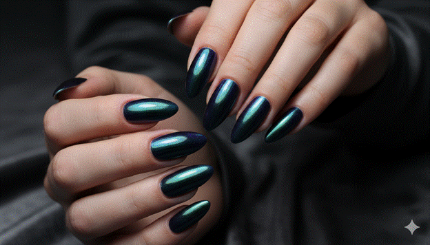 Styling Tip: Choose the base colour for an aurora jewel almond with specific intention based on the aurora colour shift you most want to foreground. A deep midnight navy base creates the most electric blue-to-green aurora spectrum. A deep forest green base emphasises the green-to-gold register with a warmth that the navy base does not create. A deep burgundy base creates the most unexpected and most specifically beautiful aurora result — the warm-red base creates an aurora powder shift that moves from copper through gold to deep violet, creating a colour story entirely unique to this base-powder combination. This specificity of base colour choice is the difference between a beautiful aurora nail and an extraordinary one.