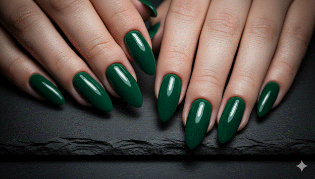 Styling Tip: Deep emerald glazed almond nails create their most dramatically beautiful aesthetic when paired with the most minimal possible jewellery — a single delicate gold ring or fine gold chain bracelet rather than multiple pieces. The emerald’s visual authority is complete in itself and does not require supplementary statement accessories; additional jewellery competes with the nail’s presence rather than complementing it. The one gold piece creates the warm-metal contrast that the deep green specifically requires and rewards, creating a colour and material dialogue of extraordinary beauty.