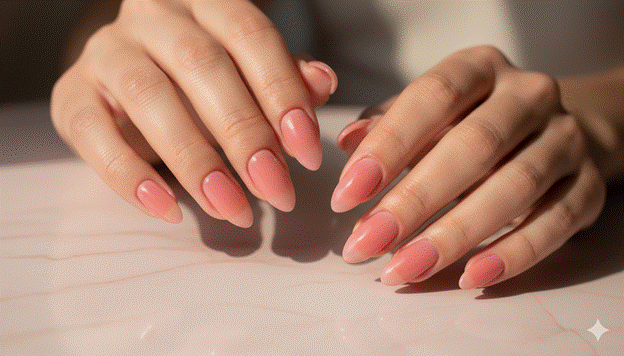 On the almond shape, the blush pink jelly creates the most specifically feminine and the most organically beautiful nail inspo style in this collection — the shape’s graceful taper and the colour’s soft, warm delicacy create a nail that reads as completely natural and completely beautiful simultaneously, as though the finger itself has been subtly blushed by warmth or by the specific quality of a warm domestic interior’s light.