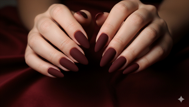 Styling Tip: The burgundy velvet matte almond nail requires absolute precision in the application of the matte top coat to maintain its characteristic, uniform velvety quality across the full curved surface of the almond nail. Apply the matte top coat in a single, slow, confident stroke from the cuticle to the tip, following the almond’s curved form, then wrap the brush carefully around the curved side walls and the rounded apex to ensure the matte finish is complete and consistent across the entire nail surface. Any section of the nail that receives a second pass of the matte top coat will appear slightly shinier than the single-pass areas, creating an uneven surface that is particularly visible on a deeply pigmented matte.