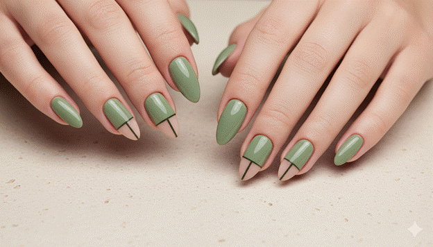 Styling Tip: The most beautiful sage green negative space almond nail uses the negative space zone in the cuticle half of the nail rather than the tip half — creating a ‘reverse French’ configuration in which the sage green occupies the tip zone and the natural bare nail is visible at the cuticle. This configuration creates a nail design that reads as more unconventional and more specifically fashion-forward than the conventional cuticle-zone negative space placement. Use nail tape applied precisely at the desired geometric boundary, apply the sage green over the tape and the tip zone, and remove the tape while the gel is uncured for the sharpest possible negative space line.