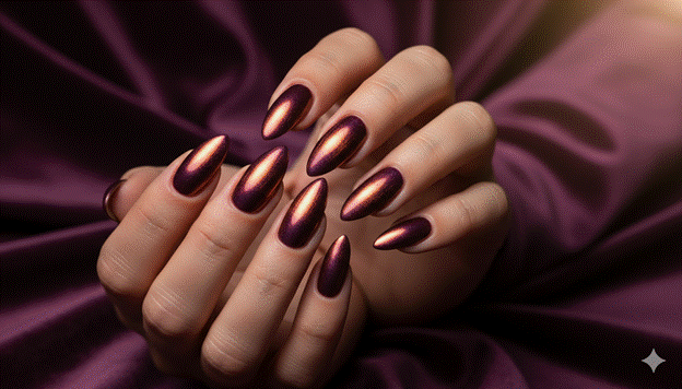 Styling Tip: A warm copper or rose gold chrome powder applied over a deep plum gel base creates the most harmonious and the most specifically beautiful plum chrome result — the warm quality of the copper chrome echoes the warm red undertone of the plum, creating a colour relationship of unified warmth rather than the cool contrast that a silver or blue chrome over the same base would create. Apply the chrome in the standard buffing technique and seal with a no-wipe top coat applied as thinly as possible. Pair deep plum chrome almond nails with minimal warm jewellery — one quality warm gold or rose gold ring — and avoid additional accessories that would compete with the nail’s considerable visual authority.