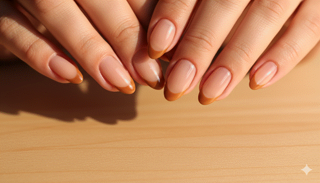 Styling Tip: The most beautiful warm caramel French almond uses a caramel gel that is warm enough to read as specifically caramel — neither too pale (which loses the distinctive warmth of the caramel tone) nor too dark (which shifts toward chocolate and loses the caramel’s characteristic lightness and warmth). The smile line should be applied using a nail guide strip curved to the almond tip’s specific radius and should be kept to a moderate width — 3-4mm — that is proportionally appropriate to the almond nail’s length. A slightly sheer rather than fully opaque caramel gel creates the most organic, most natural-looking caramel French tip quality on the almond nail.