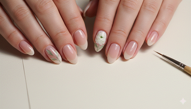 The most viral and the most consistently beautiful floral almond nail inspo designs of the current moment are those in which the botanical detail is painted with a quality of artistic restraint — a single, carefully composed bloom on an accent nail, a trailing botanical element that begins at the cuticle and extends toward the tip, a spray of tiny flowers across one nail against a clear or sheer base. The restraint of the botanical detail’s placement creates a nail that reads as art rather than decoration.