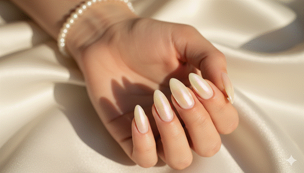 Styling Tip: The pearl white glazed unhas claras style achieves its most convincingly pearl-like quality through a three-stage layering approach: a warm ivory gel base in two thin fully cured coats; a pearl chrome powder applied in two to three soft passes with a silicone applicator — creating a soft shimmer rather than a mirror chrome; and a single coat of a multi-colour iridescent top coat that adds the final shifting lavender-pink-gold quality. Together, these three layers create a nail of genuine pearl quality — warm, luminous, and continuously shifting in its specific colour expression as the light and viewing angle change.