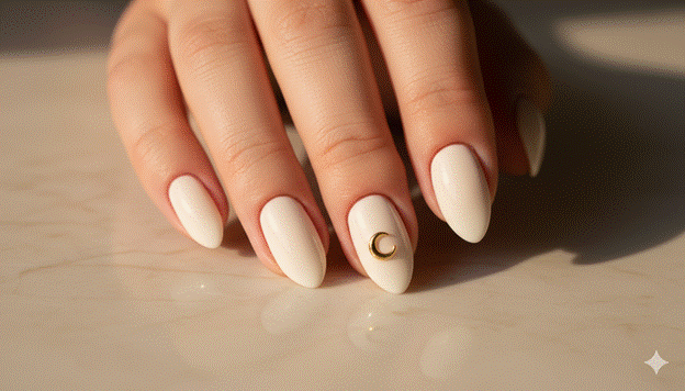 The cream white base creates a nail of warm, graphic confidence within the unhas claras light palette — warm enough to avoid clinical coolness, pale enough to maintain the light nail’s characteristic skin-enhancing luminosity. The single micro gold detail — a tiny crescent moon, a hairline accent, a single delicate dot cluster — creates the one note of individual expression that gives the entire unhas claras set a quality of personalised, considered beauty that an undecorated nail cannot achieve.
