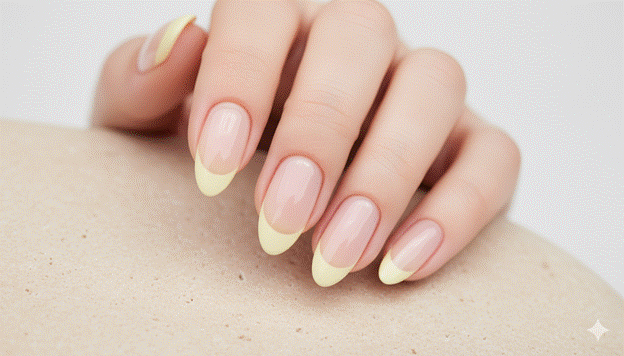Styling Tip: The pastel yellow French tip nail achieves its most beautiful result when the tip width is kept narrow — 2 to 3mm — and the smile line is curved precisely to follow the natural contour of the free edge. The pale yellow colour should be chosen in a sheer or semi-sheer formulation rather than opaque — a fully opaque pale yellow tip can read as thickly painted and lose the specific quality of warmth and lightness that the pastel yellow French tip requires. Apply over a completely sheer or clear jelly base for the most contemporary and the most luminously minimal result.