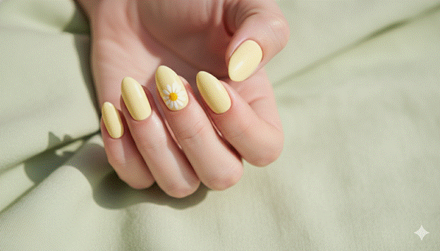 Yellow and white daisy nail art is the viral yellow nail design that carries the most universal, most immediately charming, and most specifically joyful emotional quality of any nail art design in the yellow family. A white daisy with a bright yellow centre painted on an accent nail above a clean yellow or white solid base creates a nail design of completely disarming charm — one that generates an immediate, warmly positive emotional response in virtually everyone who sees it.