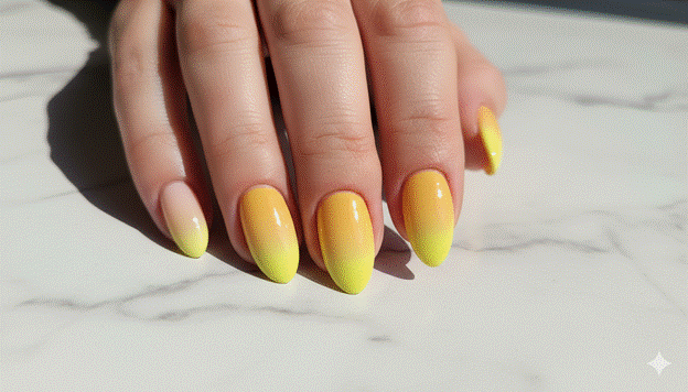 Styling Tip: Build the yellow ombre using three shades of increasing saturation — a pale, warm cream-yellow for the base, a soft canary yellow for the middle gradient zone, and a vivid bright lemon yellow for the tip — applied with a make-up sponge in the same technique as any other ombre nail. The critical technical point for a yellow ombre is opacity management: yellow gel can be challenging to make fully opaque, so allow each sponge layer to partially cure under the lamp before adding the next to prevent the under-saturated base colour from reading through the tip colour and reducing its vibrancy. A final thin coat of a clear high-shine top coat unifies the gradient surface and adds the gloss quality that makes the yellow spectrum glow with maximum warmth.