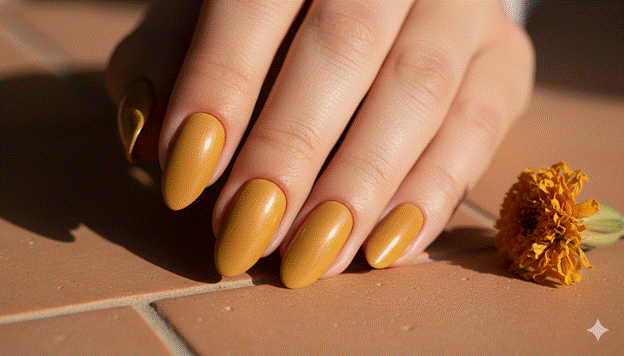 Dusty marigold yellow is the most specifically sophisticated and the most design-conscious shade in the entire yellow nail colour family — a warm, slightly desaturated, earthy yellow with a quality of aged, sun-faded beauty that is deeply appealing to the design-intelligent nail wearer. It is the yellow that references the marigold flower in its specific, complex warmth rather than simply being ‘orange-yellow’ — a colour of genuine complexity and considerable visual depth.