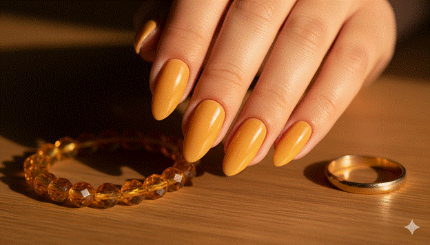 Styling Tip: Golden honey yellow nails create their most beautiful visual composition when worn with warm jewellery in the same amber-gold register: an amber stone ring, a warm gold bangle, or a strand of honey-coloured beads create a material palette of complete warmth and tonal coherence across the hand. Avoid silver or cool-toned metal accessories with golden honey nails — the cool metal creates a dissonance with the warm amber-yellow that interrupts the colour’s characteristic warmth. Pair with a warm-toned outfit in camel, cream, or warm white for the most colour-cohesive and the most specifically beautiful overall look.
